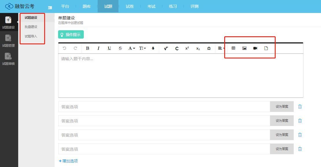 系统支持word格式、纯文本格式的试题批量录入、批量删除、试题预览编辑、批量审核;支持复杂的公式、图形图像、表格、具有上下标、音频、视频等的编辑录入。