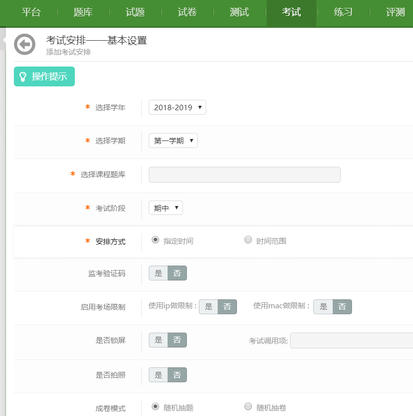 按固定时间或循环批次的模式安排考场人数、考试开始结束时间、参加该课程考试学生、监考教师、主观题阅卷老师、学生端随机抽题还是随机抽卷的成卷规则等考试规则的设定。