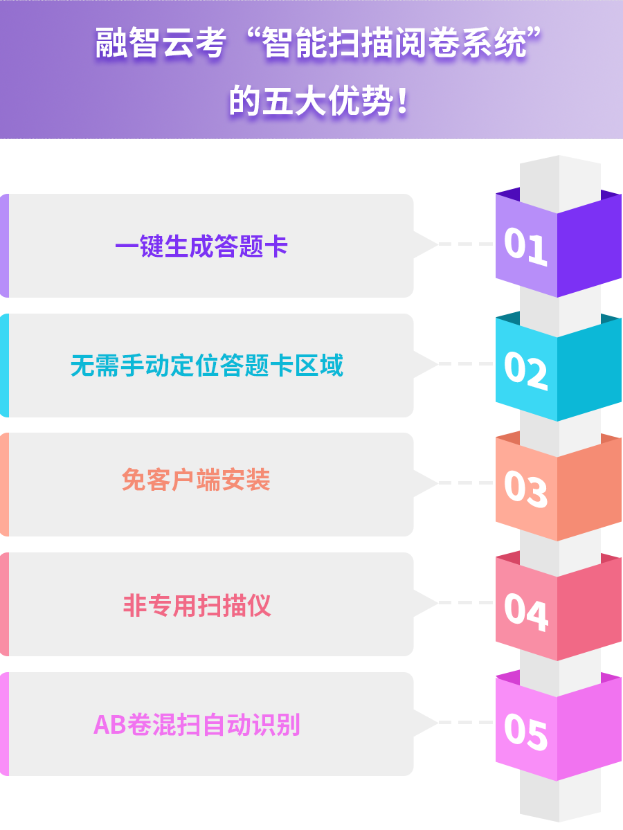 相对于传统扫描阅卷系统,融智云考的智能扫描阅卷系统有着非常明显的五大优势!