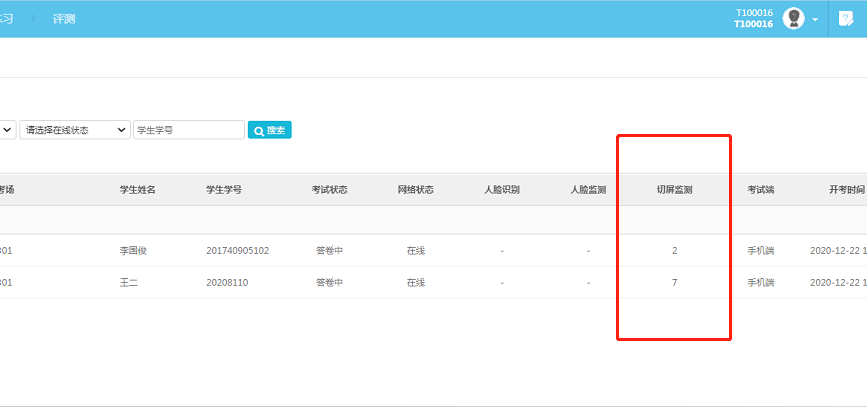 通过“切屏检测”功能,后台可以准确地显示出考生切屏的次数,教师可以通过后台进行警告,或强制交卷。