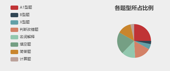 “卫生化学”题库包括A1型题、B型题、X型题、判断改错题、名词解释题、填空题、简答题、计算题等八大题型。主客观题比例为7:3。