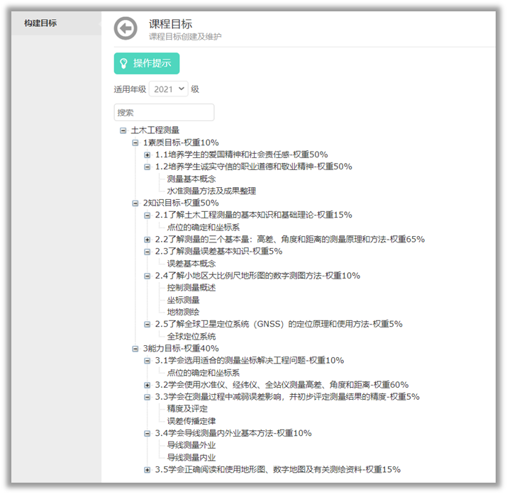融智云考的OBE课程目标达成度系统支持完整的课程目标建设,教师可将课程目标进行细分,并对相应的课程目标设置考核方式(考试、作业、考勤、课堂表现等)。