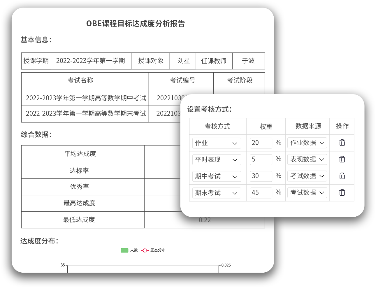 教师可关联一场或多场考试用于达成度计算,支持过程性考核的数据导入,比如作业数据、考勤数据等。