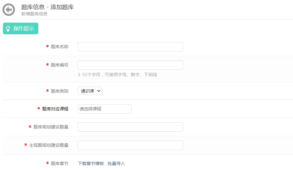 单题建设:用户只需在系统中根据编辑页面提示框选择试题类型、难易度、章节,输入试题内容答案等即可导入试题。