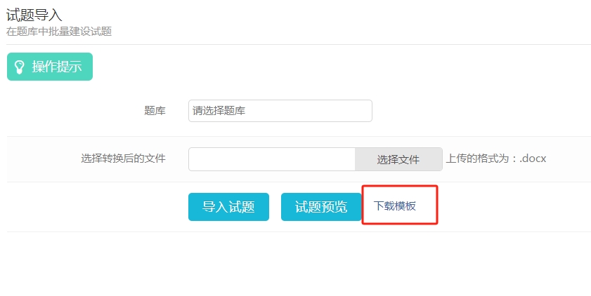 批量导入:下载系统提供的模板,按照模板要求填入试题内容后一键上传。